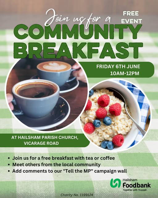 Our next Community Breakfast is being hosted by the campaigns team ‘Local Change’. The free event is tomorrow 10am-12pm at Hailsham Parish Church. Meet other locals and enjoy tea, coffee, lots of fruit, pastries and hopefully some bacon and egg baps too! ๐Ÿ“๐Ÿฅโ˜•
