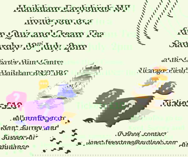 Hosted by Hailsham Earlybirds WI in aid of Kent, Surrey and Sussex Air Ambulance. To book contact Janet.freestone@outlook.com.