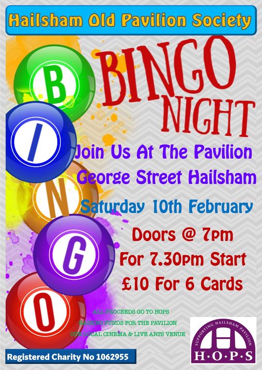 Support Hailsham Old Pavilion Society (HOPS) at their Bingo Night. Doors open at 7pm for eyes down at 7.30pm. It is £10 for 6 cards. All proceeds go to HOPS, your local cinema and live events venue.