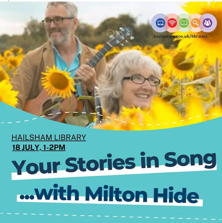 Join music duo Milton Hide in Hailsham Library for an hour from 1pm. They will perform some of their story-based songs and talk about the stories that inspired them. You can share some of your own stories, join in with singing if you like and maybe even help write a quick chorus of a song. No booking required, free to attend, just turn up.